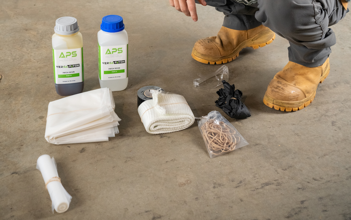 Open the appropriate Versa-Patch kit for your pipe diameter and patch length. Each kit includes a pre-cut fiberglass patch, pre-poured resin (Parts A and B), elastic bands, tape, gloves, and disposable materials for easy cleanup. Verify that your packer, hoses, and fittings are clean and functioning properly before starting.